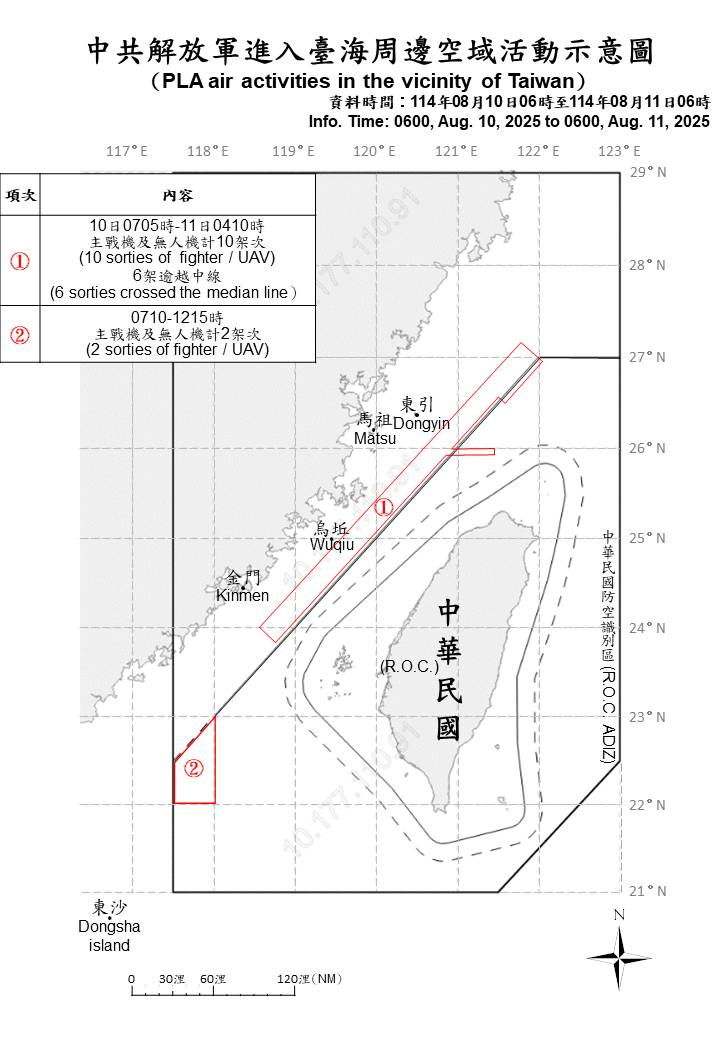 迄0600時止,偵獲共機12架次(其中逾越海峽中線進入北部及西南空域8架次)及共艦9艘、公務船2艘,持續在臺海周邊活動。國軍運用任務機、艦及岸置飛彈系統嚴密監控與應處。