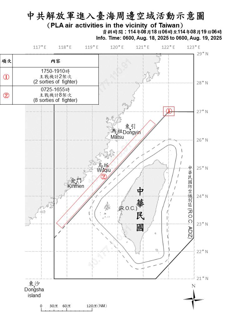 10 sorties of PLA aircraft and 6 PLAN ships operating around Taiwan were detected as of 6 a.m. (UTC+8) today. 2 out of 10 sorties crossed the median line of the Taiwan Strait and entered Taiwan’s northern ADIZ. ROC Armed Forces have monitored the situation and employed CAP aircraft, Navy ships, and coastal missile systems in response to detected activities.