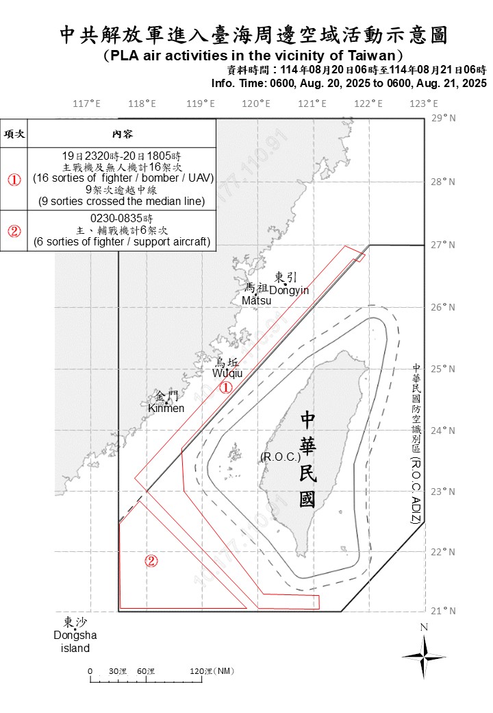 22 sorties of PLA aircraft and 5 PLAN ships operating around Taiwan were detected as of 6 a.m. (UTC+8) today. 15 out of 22 sorties crossed the median line of the Taiwan Strait and entered Taiwan’s northern and southwestern ADIZ. ROC Armed Forces have monitored the situation and employed CAP aircraft, Navy ships, and coastal missile systems in response to detected activities.