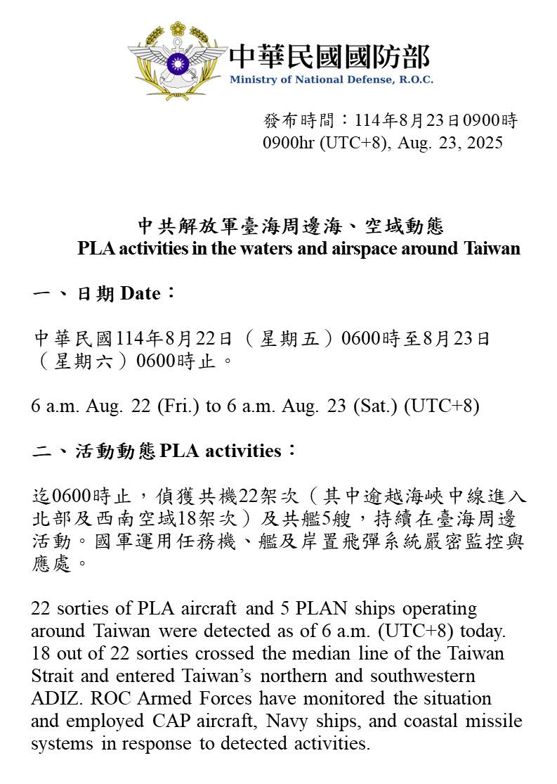 22 sorties of PLA aircraft and 5 PLAN ships operating around Taiwan were detected as of 6 a.m. (UTC+8) today. 18 out of 22 sorties crossed the median line of the Taiwan Strait and entered Taiwan’s northern and southwestern ADIZ. ROC Armed Forces have monitored the situation and employed CAP aircraft, Navy ships, and coastal missile systems in response to detected activities.