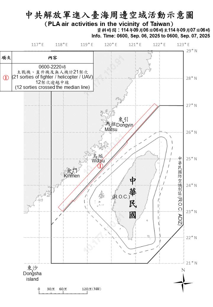 21 sorties of PLA aircraft, 6 PLAN ships, and 2 official ships operating around Taiwan were detected as of 6 a.m. (UTC+8) today. 12 out of 21 sorties crossed the median line of the Taiwan Strait. ROC Armed Forces have monitored the situation and employed CAP aircraft, Navy ships, and coastal missile systems in response to detected activities.