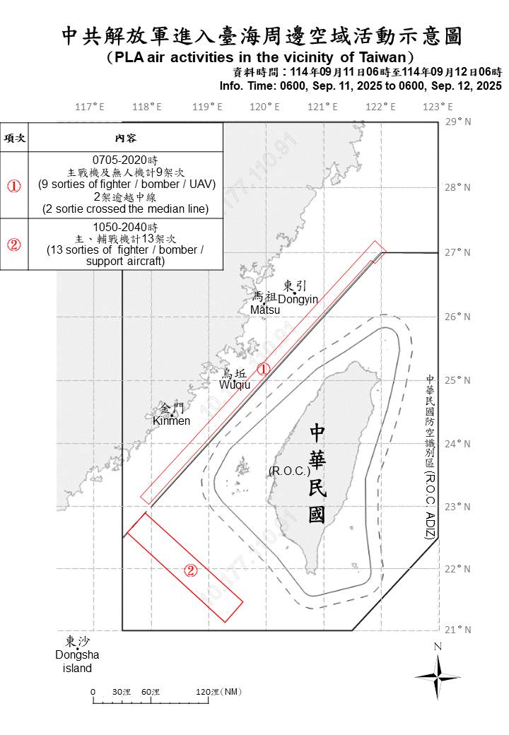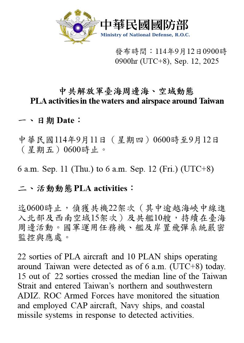 迄0600時止,偵獲共機22架次(其中逾越海峽中線進入北部及西南空域15架次)及共艦10艘,持續在臺海周邊活動。國軍運用任務機、艦及岸置飛彈系統嚴密監控與應處。