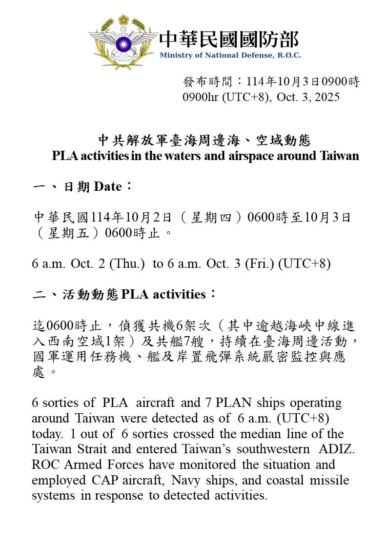 6 sorties of PLA aircraft and 7 PLAN ships operating around Taiwan were detected as of 6 a.m. (UTC+8) today. 1 out of 6 sorties crossed the median line of the Taiwan Strait and entered Taiwan’s southwestern ADIZ. ROC Armed Forces have monitored the situation and employed CAP aircraft, Navy ships, and coastal missile systems in response to detected activities.