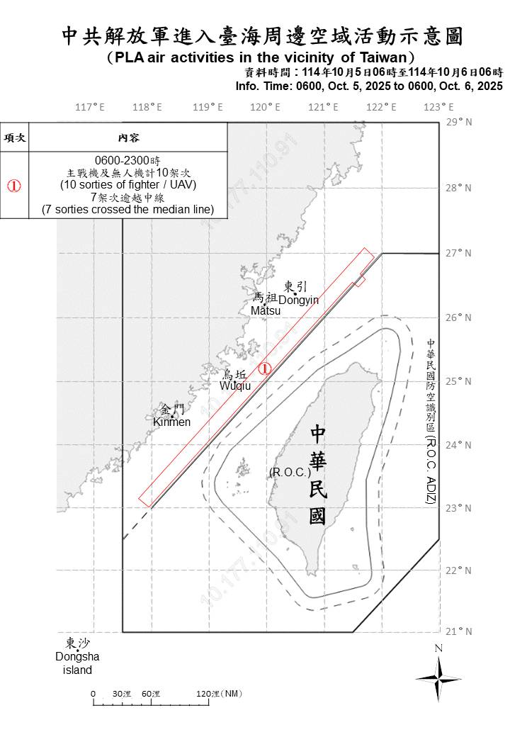 10 sorties of PLA aircraft and 6 PLAN ships operating around Taiwan were detected as of 6 a.m. (UTC+8) today. 7 out of 10 sorties crossed the median line of the Taiwan Strait and entered Taiwan’s northern ADIZ. ROC Armed Forces have monitored the situation and employed CAP aircraft, Navy ships, and coastal missile systems in response to detected activities.