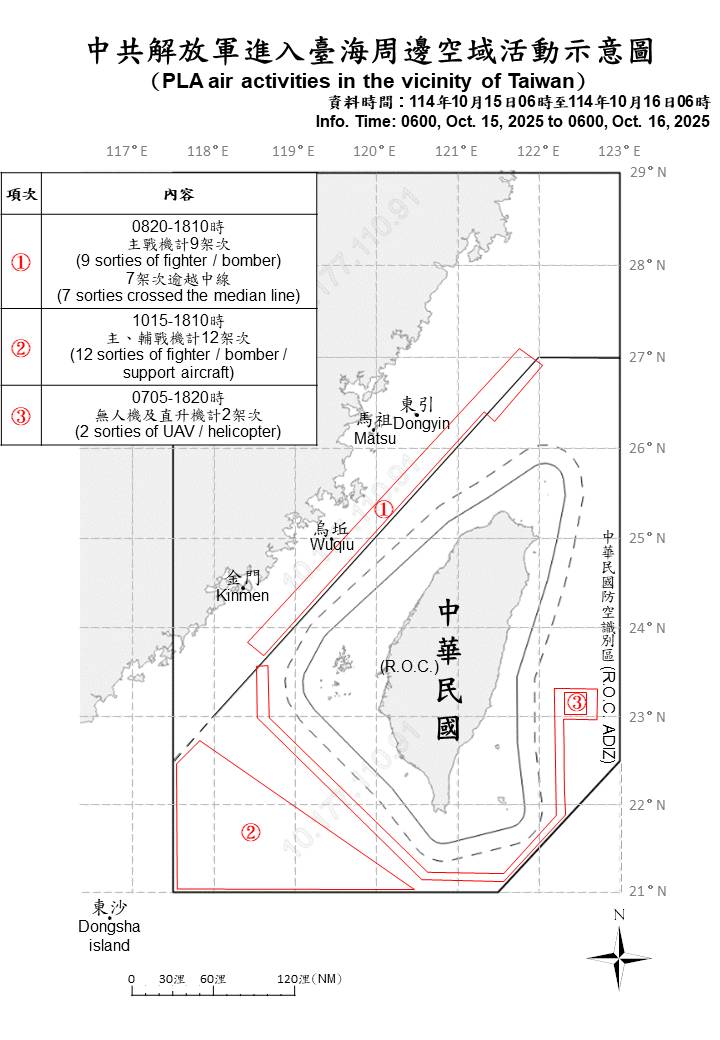 迄0600時止,偵獲共機23架次(其中逾越中線進入北部、西南及東部空域計21架次)及共艦8艘、公務船2艘,持續在臺海周邊活動。國軍運用任務機、艦及岸置飛彈系統嚴密監控與應處。