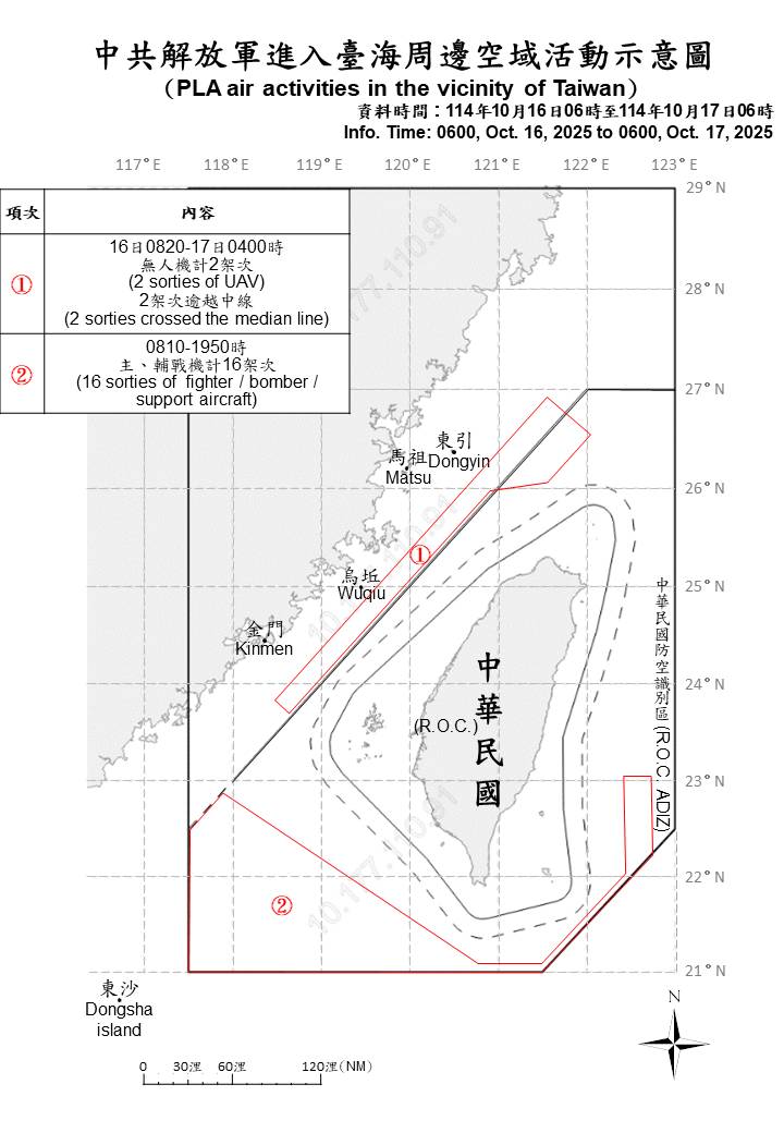 迄0600時止,偵獲共機18架次(逾越中線進入北部、西南及東部空域計18架次)及共艦9艘,持續在臺海周邊活動。國軍運用任務機、艦及岸置飛彈系統嚴密監控與應處。