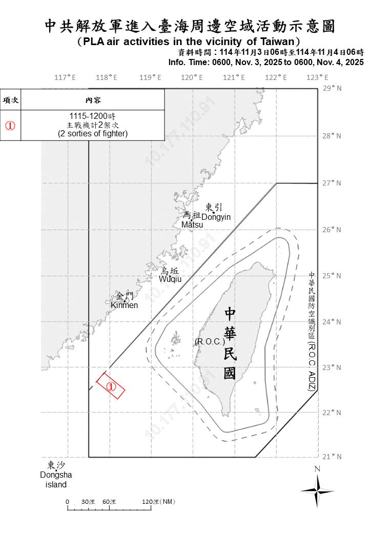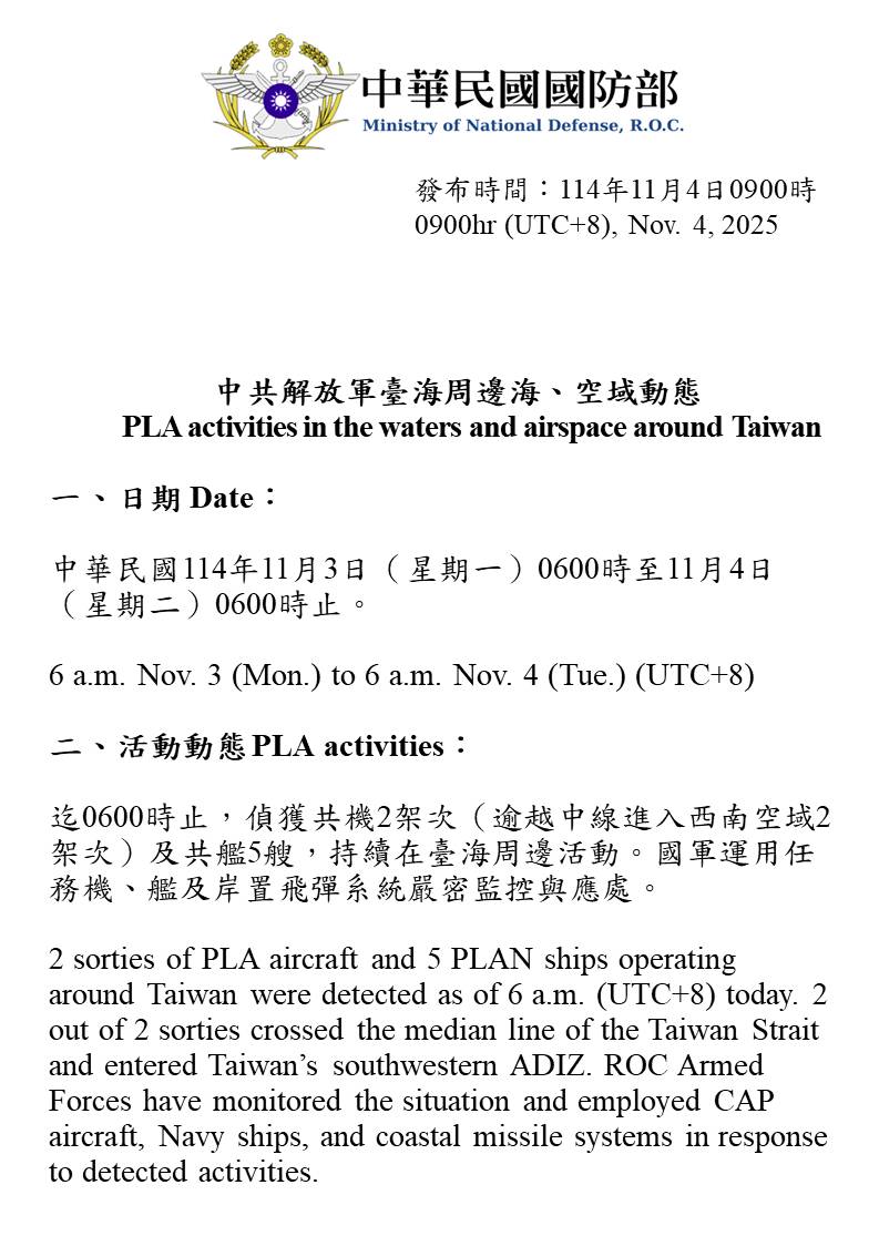迄0600時止,偵獲共機2架次(逾越中線進入西南空域2架次)及共艦5艘,持續在臺海周邊活動。國軍運用任務機、艦及岸置飛彈系統嚴密監控與應處。