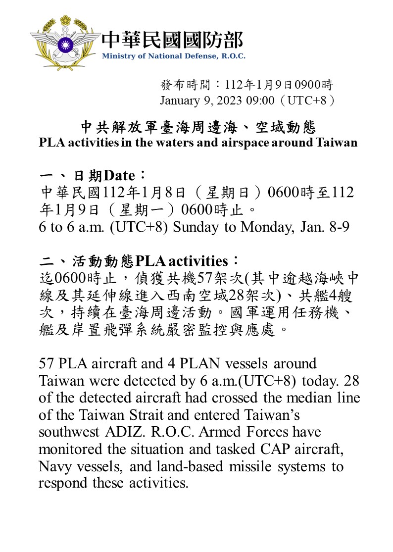 迄0600時止,偵獲共機57架次(其中逾越海峽中線及其延伸線進入西南空域28架次)、共艦4艘次,持續在臺海周邊活動。國軍運用任務機、艦及岸置飛彈系統嚴密監控與應處。