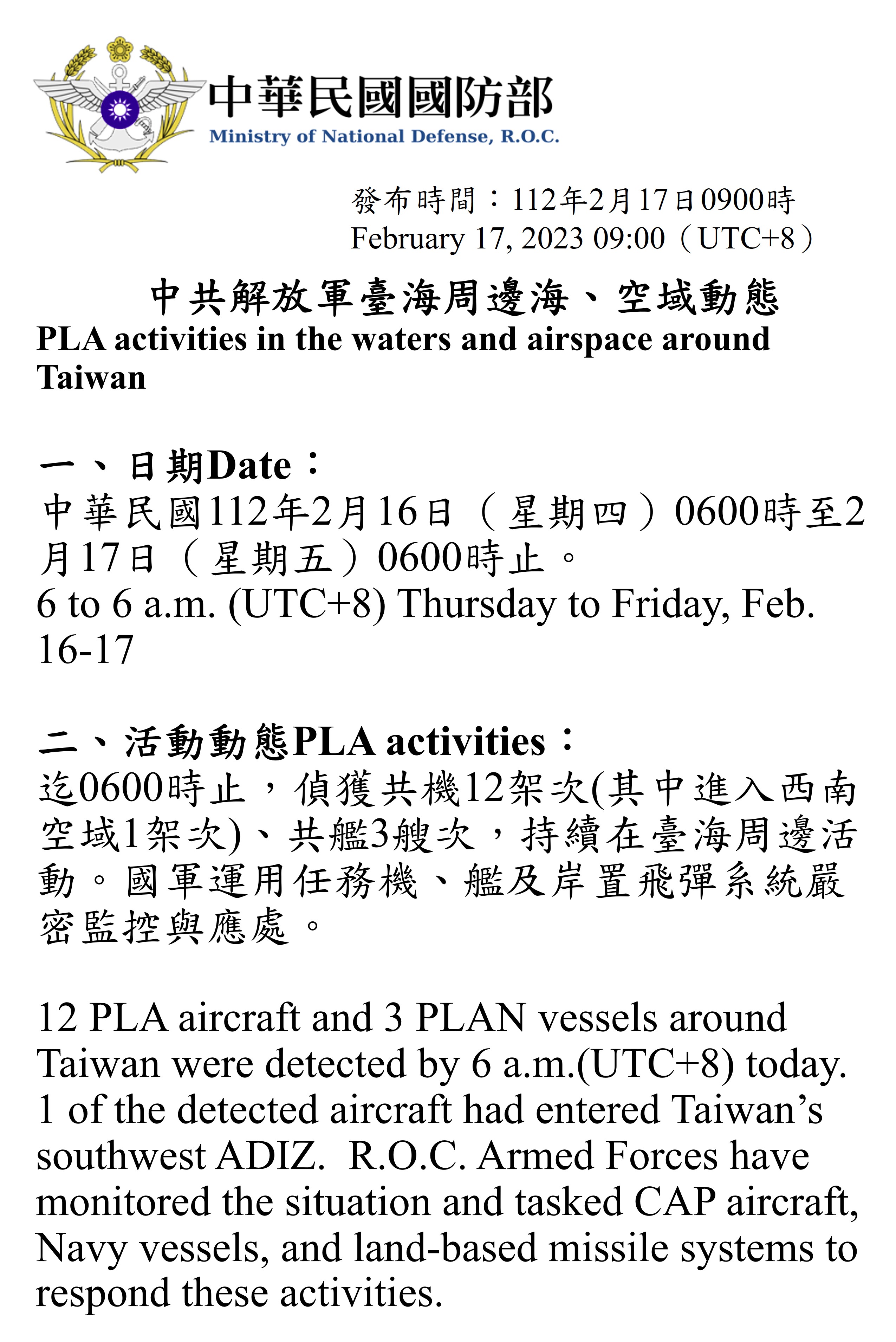 二、活動動態: 迄0600時止,偵獲共機12架次(其中進入西南空域1架次)、共艦3艘次,持續在臺海周邊活動。國軍運用任務機、艦及岸置飛彈系統嚴密監控與應處。