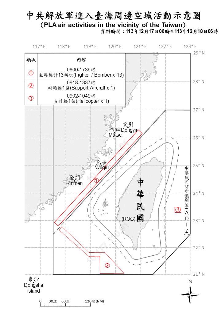 15 PLA aircraft and 9 PLAN vessels and 4 official ships operating around Taiwan were detected up until 6 a.m. (UTC+8) today. 2 of the aircraft crossed the median line of the Taiwan Strait and entered Taiwan’s southwestern , and eastern ADIZ. ROC Armed Forces have monitored the situation and employed CAP aircraft, Navy vessels, and coastal missile systems in response to the detected activities.