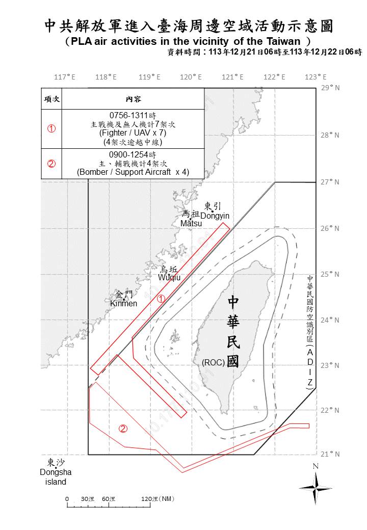 11 PLA aircraft and 6 PLAN vessels operating around Taiwan were detected up until 6 a.m. (UTC+8) today. 8 of the aircraft crossed the median line of the Taiwan Strait, and entered Taiwan’s southwestern and southeastern ADIZ. ROC Armed Forces have monitored the situation and employed CAP aircraft, Navy vessels, and coastal missile systems in response to the detected activities.