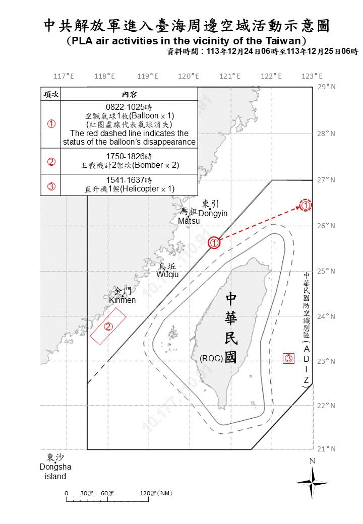 3 PLA aircraft and 6 PLAN vessels operating around Taiwan were detected up until 6 a.m. (UTC+8) today. 1 of the aircraft entered Taiwan’s eastern ADIZ. ROC Armed Forces have monitored the situation and employed CAP aircraft, Navy vessels, and coastal missile systems in response to the detected activities.