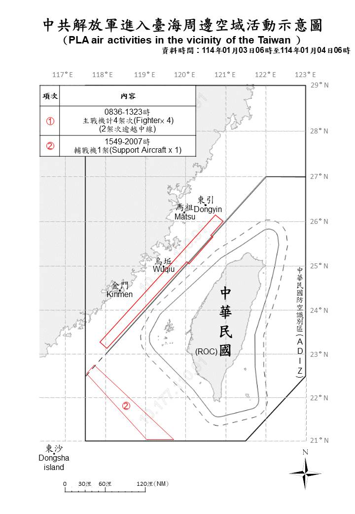 5 PLA aircraft and 7 PLAN vessels operating around Taiwan were detected up until 6 a.m. (UTC+8) today. 3 of the aircraft crossed the median line of the Taiwan Strait and entered Taiwan’s southwestern ADIZ. ROC Armed Forces have monitored the situation and employed CAP aircraft, Navy vessels, and coastal missile systems in response to the detected activities.