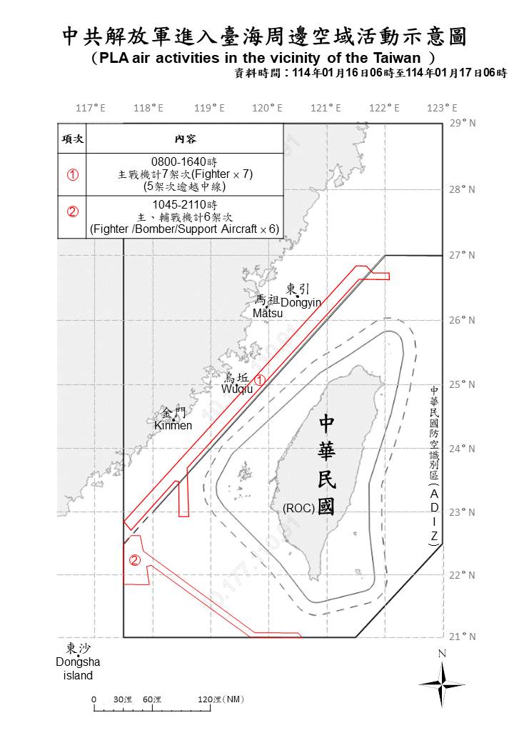 13 PLA aircraft and 7 PLAN vessels operating around Taiwan were detected up until 6 a.m. (UTC+8) today. 11 of the aircraft crossed the median line of the Taiwan Strait and entered Taiwan’s northern and southwestern ADIZ. ROC Armed Forces have monitored the situation and employed CAP aircraft, Navy vessels, and coastal missile systems in response to the detected activities.