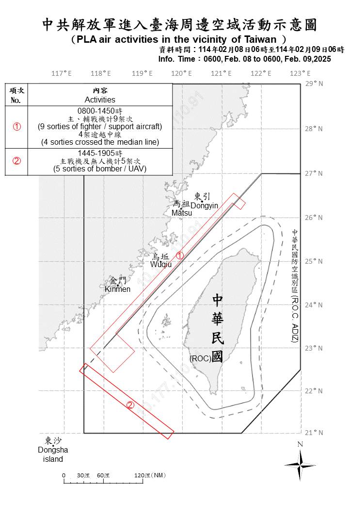 14 sorties of PLA aircraft and 6 PLAN ships and operating around Taiwan were detected as of 6 a.m. (UTC+8) today. 9 out of 14 sorties crossed the median line of the Taiwan Strait and entered Taiwan’s northern and southwestern ADIZ. ROC Armed Forces have monitored the situation and employed CAP aircraft, Navy ships, and coastal missile systems in response to detected activities.
