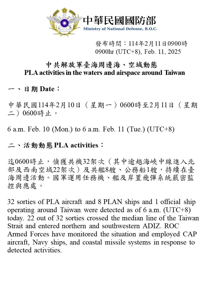 32 sorties of PLA aircraft and 8 PLAN ships and 1 official ship operating around Taiwan were detected as of 6 a.m. (UTC+8) today. 22 out of 32 sorties crossed the median line of the Taiwan Strait and entered northern and southwestern ADIZ. ROC Armed Forces have monitored the situation and employed CAP aircraft, Navy ships, and coastal missile systems in response to detected activities.