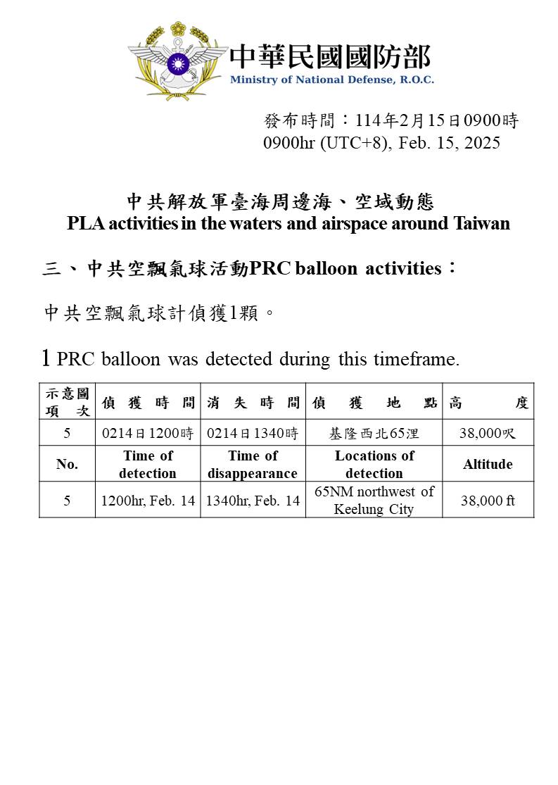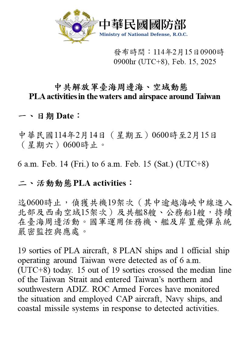19 sorties of PLA aircraft, 8 PLAN ships and 1 official ship operating around Taiwan were detected as of 6 a.m. (UTC+8) today. 15 out of 19 sorties crossed the median line of the Taiwan Strait and entered Taiwan’s northern and southwestern ADIZ. ROC Armed Forces have monitored the situation and employed CAP aircraft, Navy ships, and coastal missile systems in response to detected activities.