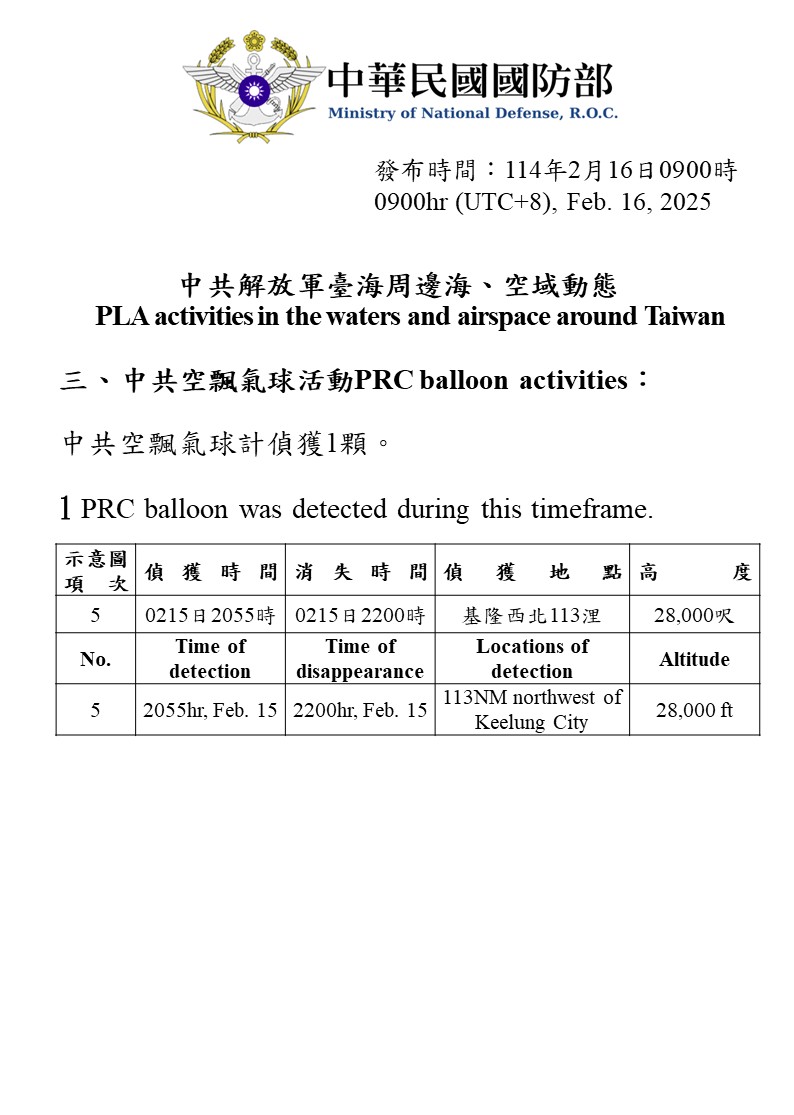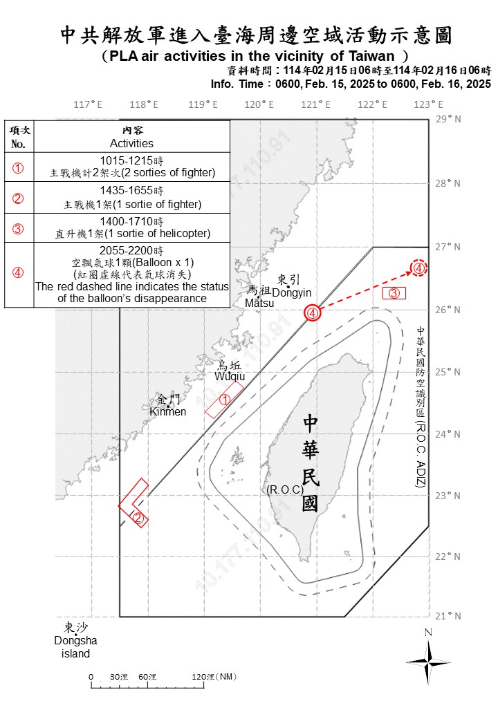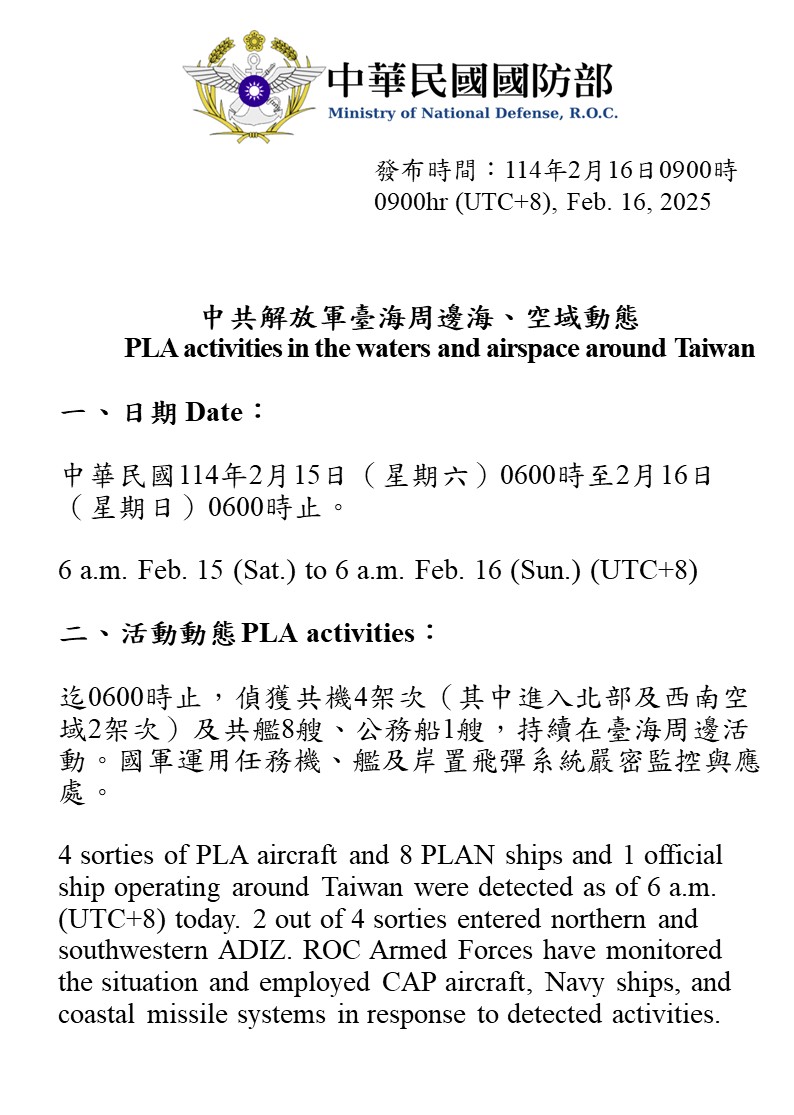 4 sorties of PLA aircraft and 8 PLAN ships and 1 official ship operating around Taiwan were detected as of 6 a.m. (UTC+8) today. 2 out of 4 sorties entered northern and southwestern ADIZ. ROC Armed Forces have monitored the situation and employed CAP aircraft, Navy ships, and coastal missile systems in response to detected activities.