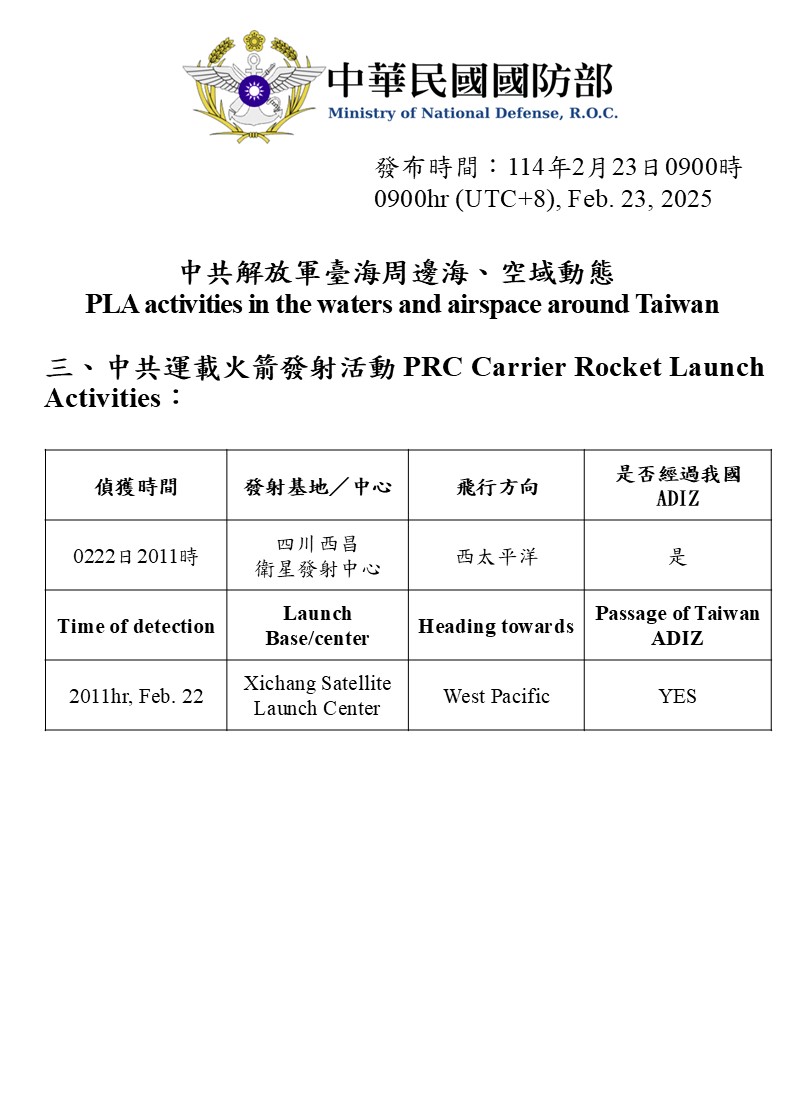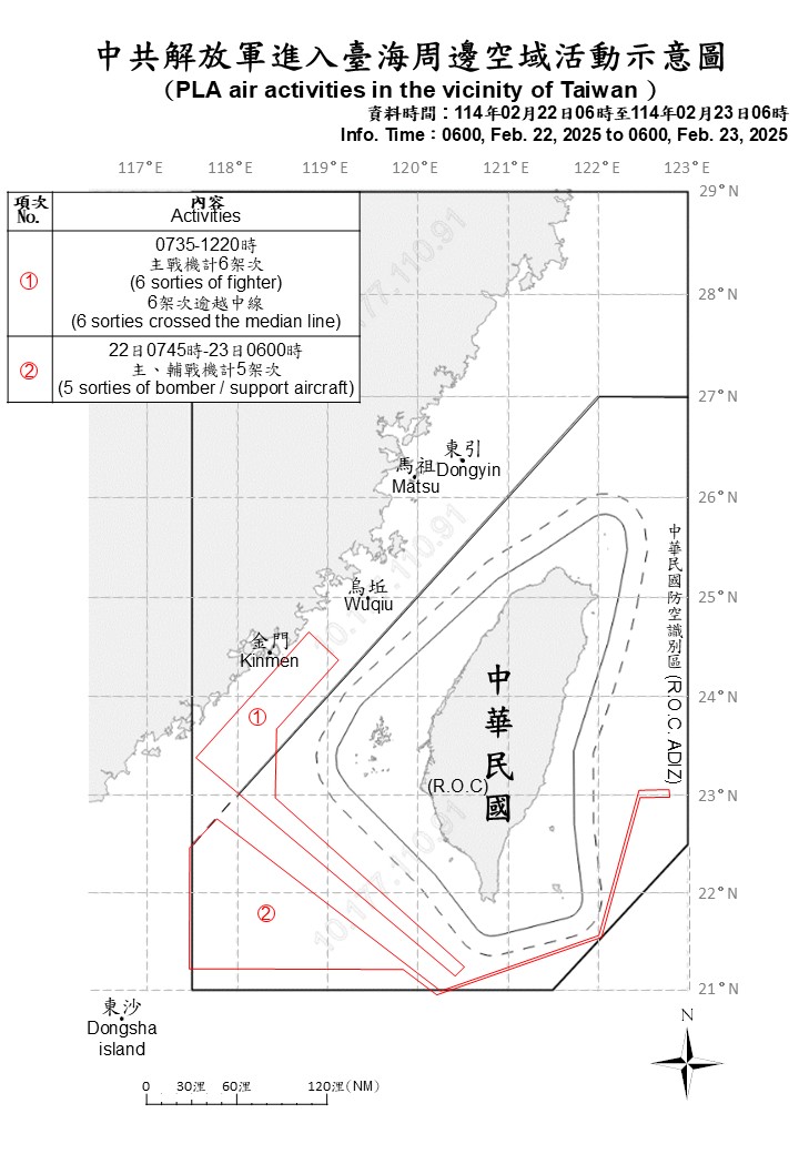 11 sorties of PLA aircraft, 6 PLAN ships and 2 official ships operating around Taiwan were detected as of 6 a.m. (UTC+8) today. 11 out of 11 sorties crossed the median line of the Taiwan Strait and entered Taiwan’s eastern and southwestern ADIZ. ROC Armed Forces have monitored the situation and employed CAP aircraft, Navy ships, and coastal missile systems in response to detected activities.