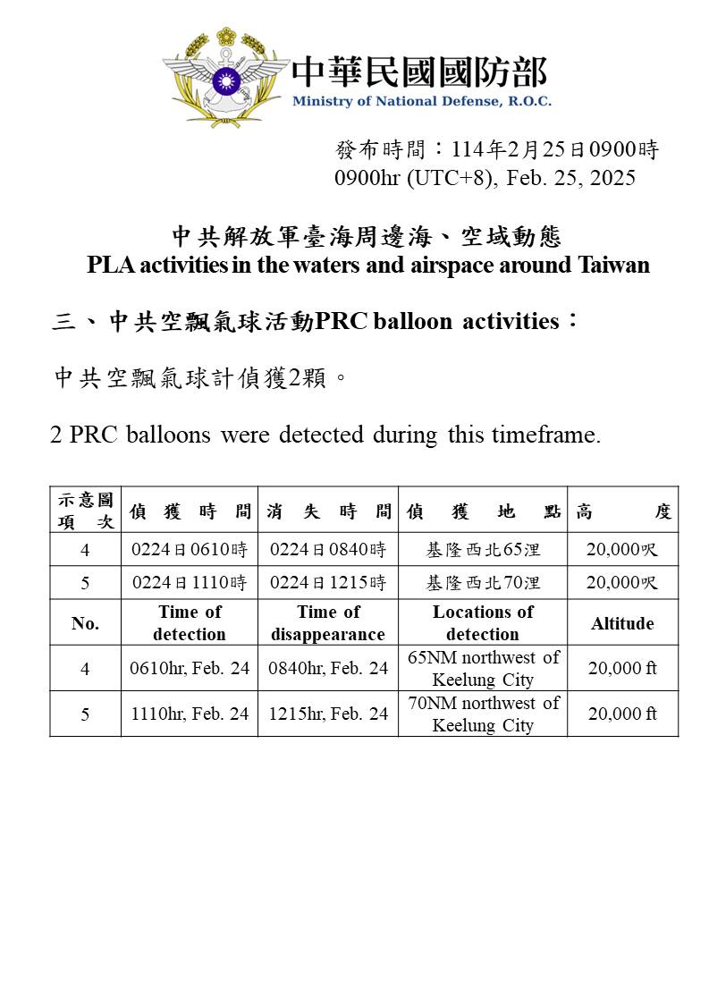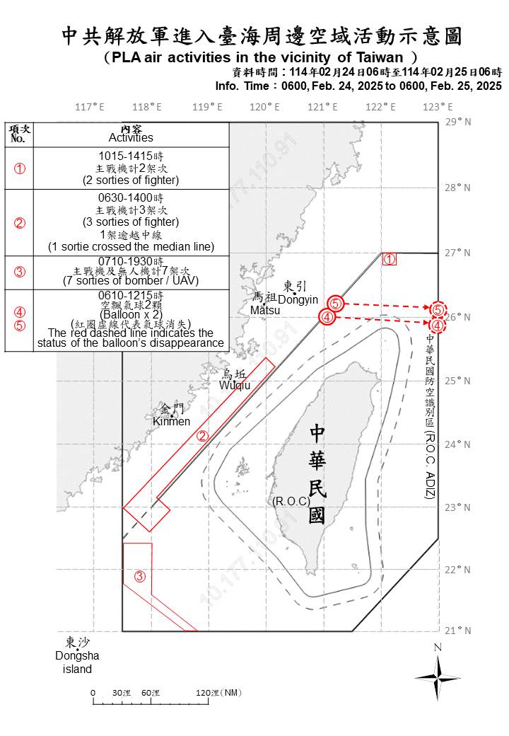 12 sorties of PLA aircraft, 14 PLAN ships and 1 official ship operating around Taiwan were detected as of 6 a.m. (UTC+8) today. 10 out of 12 sorties crossed the median line of the Taiwan Strait and entered Taiwan’s northern and southwestern ADIZ. ROC Armed Forces have monitored the situation and employed CAP aircraft, Navy ships, and coastal missile systems in response to detected activities.