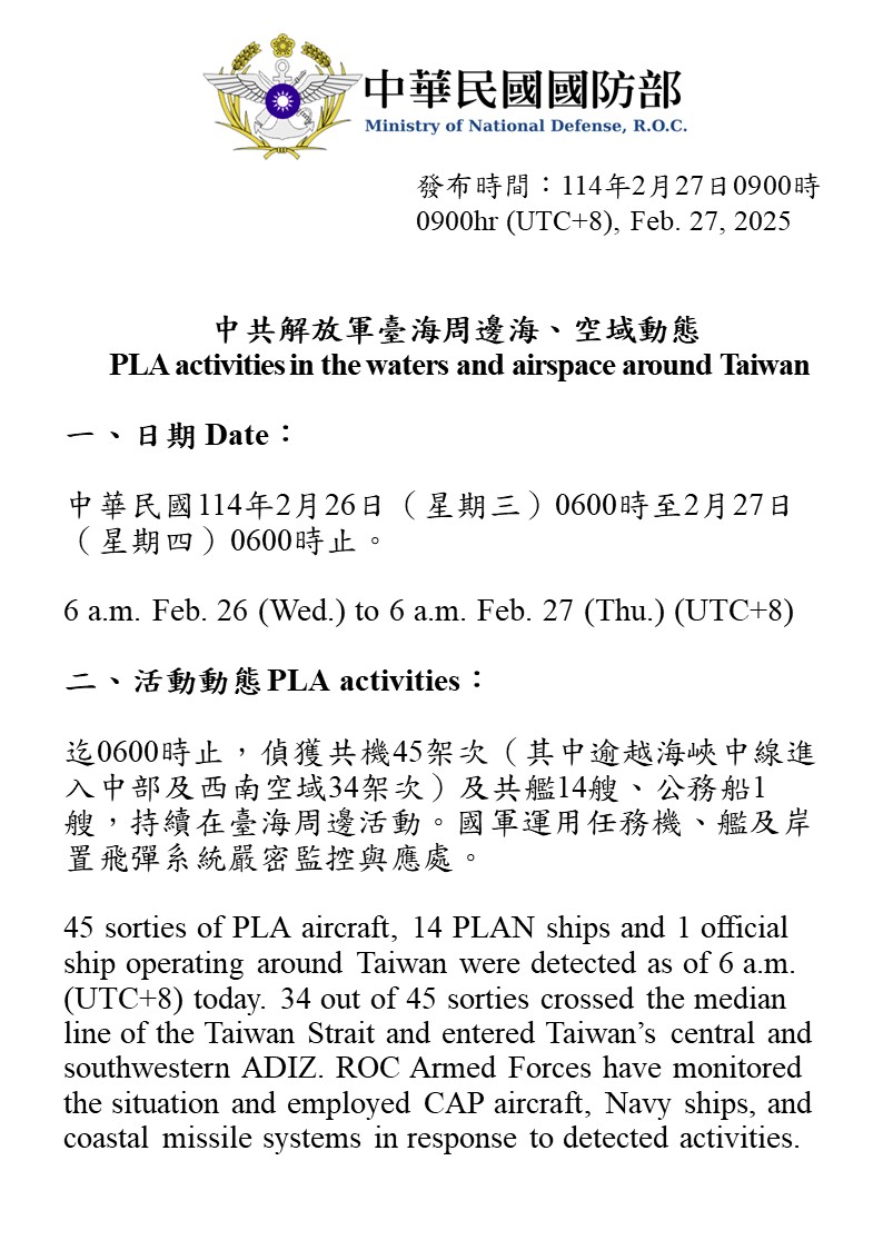 45 sorties of PLA aircraft, 14 PLAN ships and 1 official ship operating around Taiwan were detected as of 6 a.m. (UTC+8) today. 34 out of 45 sorties crossed the median line of the Taiwan Strait and entered Taiwan’s central and southwestern ADIZ. ROC Armed Forces have monitored the situation and employed CAP aircraft, Navy ships, and coastal missile systems in response to detected activities.
