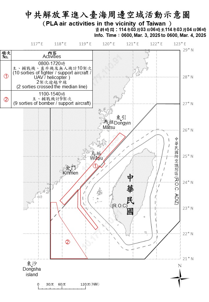 19 sorties of PLA aircraft, 5 PLAN ships and 3 official ships operating around Taiwan were detected as of 6 a.m. (UTC+8) today. 11 out of 19 sorties crossed the median line of the Taiwan Strait and entered Taiwan’s southwestern ADIZ. ROC Armed Forces have monitored the situation and employed CAP aircraft, Navy ships, and coastal missile systems in response to detected activities.