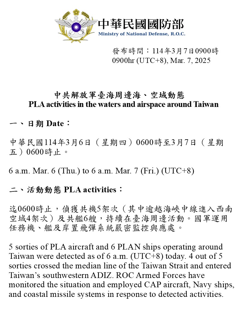 5 sorties of PLA aircraft and 6 PLAN ships operating around Taiwan were detected as of 6 a.m. (UTC+8) today. 4 out of 5 sorties crossed the median line of the Taiwan Strait and entered Taiwan’s southwestern ADIZ. ROC Armed Forces have monitored the situation and employed CAP aircraft, Navy ships, and coastal missile systems in response to detected activities.