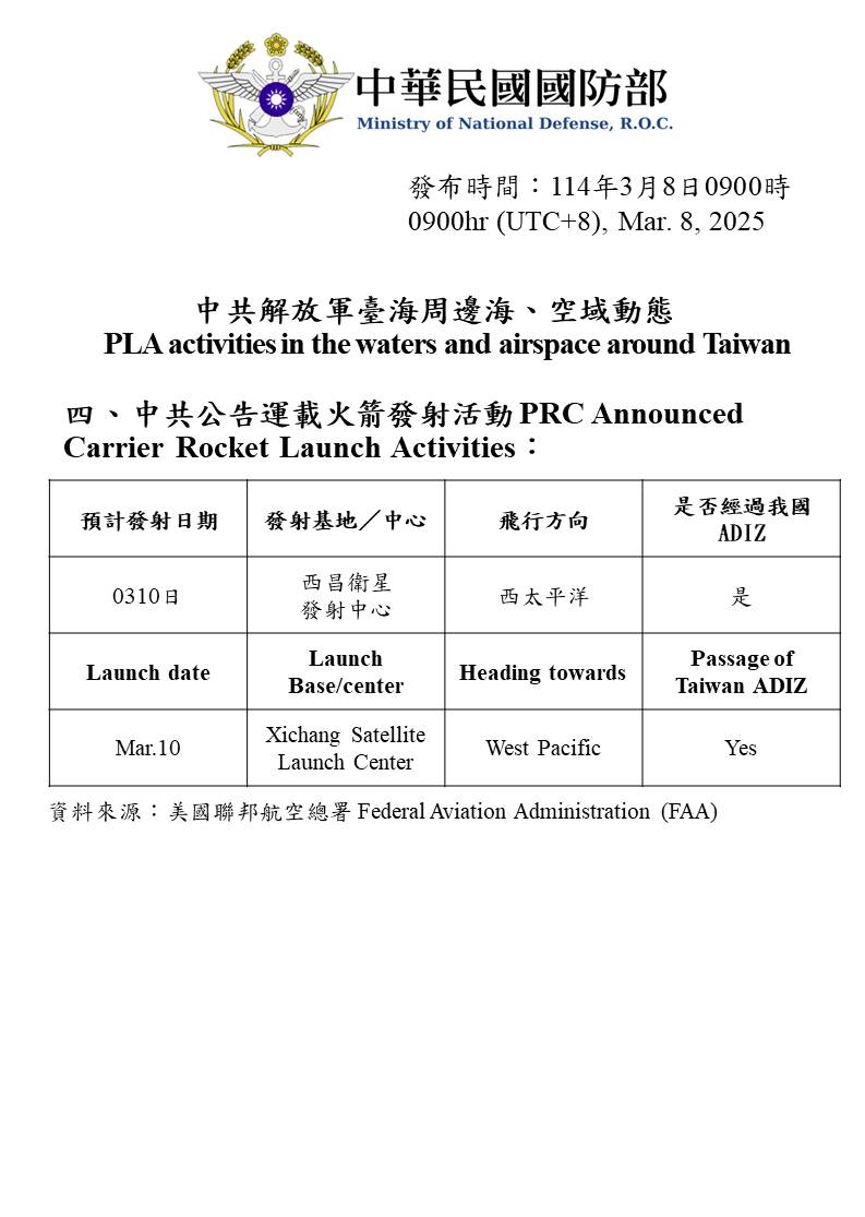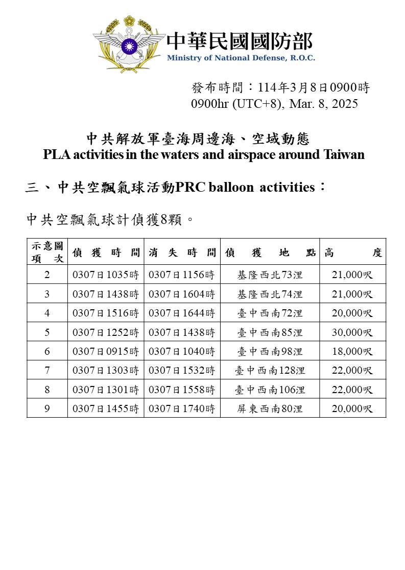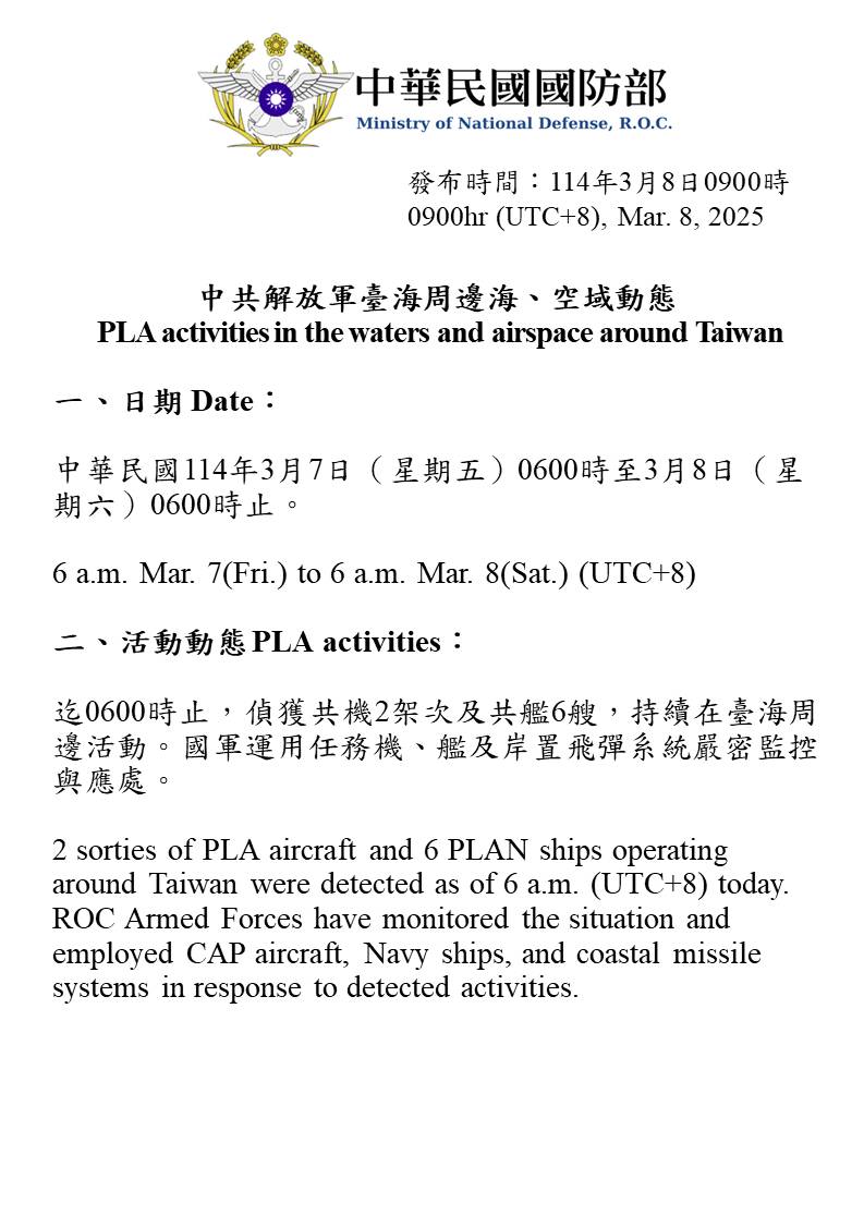 2 sorties of PLA aircraft and 6 PLAN ships operating around Taiwan were detected as of 6 a.m. (UTC+8) today. ROC Armed Forces have monitored the situation and employed CAP aircraft, Navy ships, and coastal missile systems in response to detected activities.