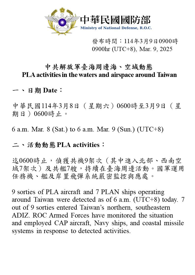 9 sorties of PLA aircraft and 7 PLAN ships operating around Taiwan were detected as of 6 a.m. (UTC+8) today. 7 out of 9 sorties entered Taiwan’s northern, southeastern ADIZ. ROC Armed Forces have monitored the situation and employed CAP aircraft, Navy ships, and coastal missile systems in response to detected activities.