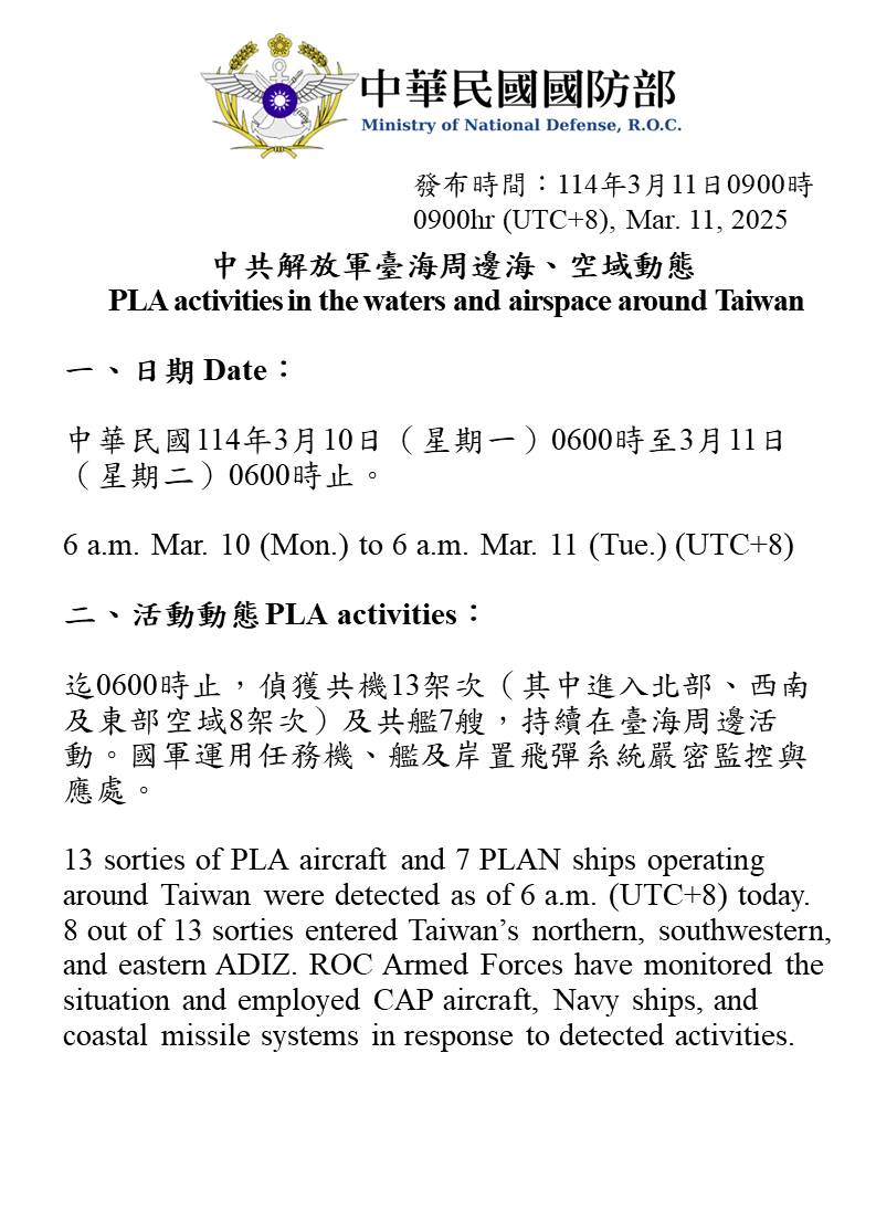 13 sorties of PLA aircraft and 7 PLAN ships operating around Taiwan were detected as of 6 a.m. (UTC+8) today. 8 out of 13 sorties entered Taiwan’s northern, southwestern, and eastern ADIZ. ROC Armed Forces have monitored the situation and employed CAP aircraft, Navy ships, and coastal missile systems in response to detected activities.