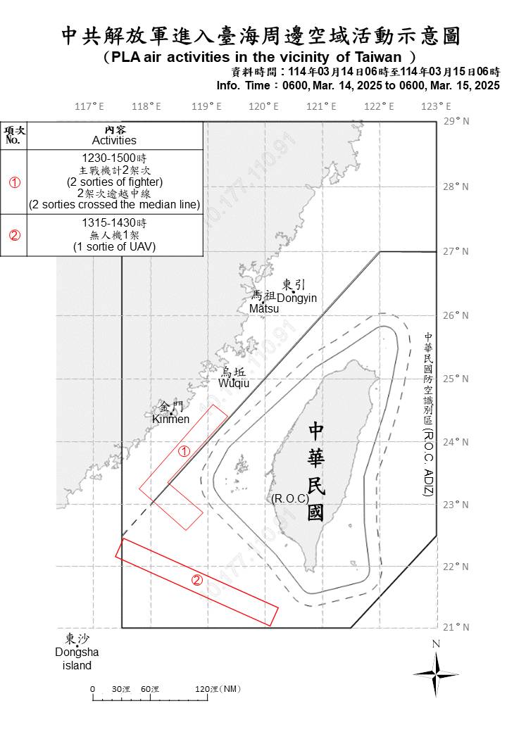3 sorties of PLA aircraft, 9 PLAN ships and 1 official ship operating around Taiwan were detected as of 6 a.m. (UTC+8) today. 3 out of 3 sorties crossed the median line of the Taiwan Strait and entered Taiwan’s southwestern ADIZ. ROC Armed Forces have monitored the situation and employed CAP aircraft, Navy ships, and coastal missile systems in response to detected activities.
