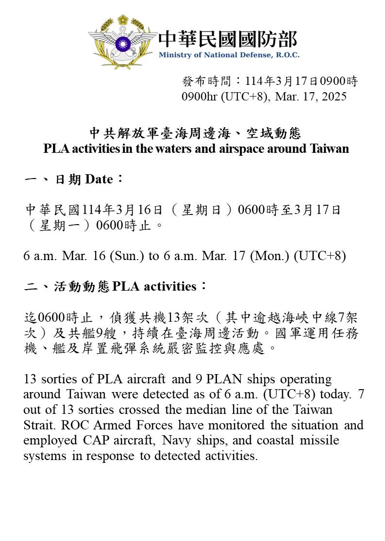 13 sorties of PLA aircraft and 9 PLAN ships operating around Taiwan were detected as of 6 a.m. (UTC+8) today. 7 out of 13 sorties crossed the median line of the Taiwan Strait. ROC Armed Forces have monitored the situation and employed CAP aircraft, Navy ships, and coastal missile systems in response to detected activities.