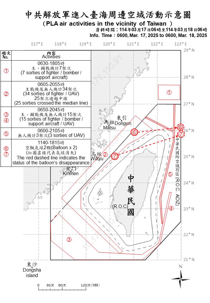59 sorties of PLA aircraft and 9 PLAN ships operating around Taiwan were detected as of 6 a.m. (UTC+8) today. 43 out of 59 sorties crossed the median line of the Taiwan Strait and entered Taiwan’s northern, central southwestern and eastern ADIZ. ROC Armed Forces have monitored the situation and employed CAP aircraft, Navy ships, and coastal missile systems in response to detected activities.