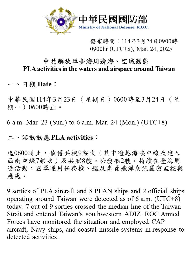 9 sorties of PLA aircraft and 8 PLAN ships and 2 official ships operating around Taiwan were detected as of 6 a.m. (UTC+8) today. 7 out of 9 sorties crossed the median line of the Taiwan Strait and entered Taiwan’s southwestern ADIZ. ROC Armed Forces have monitored the situation and employed CAP aircraft, Navy ships, and coastal missile systems in response to detected activities.