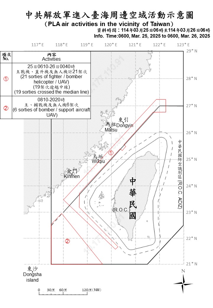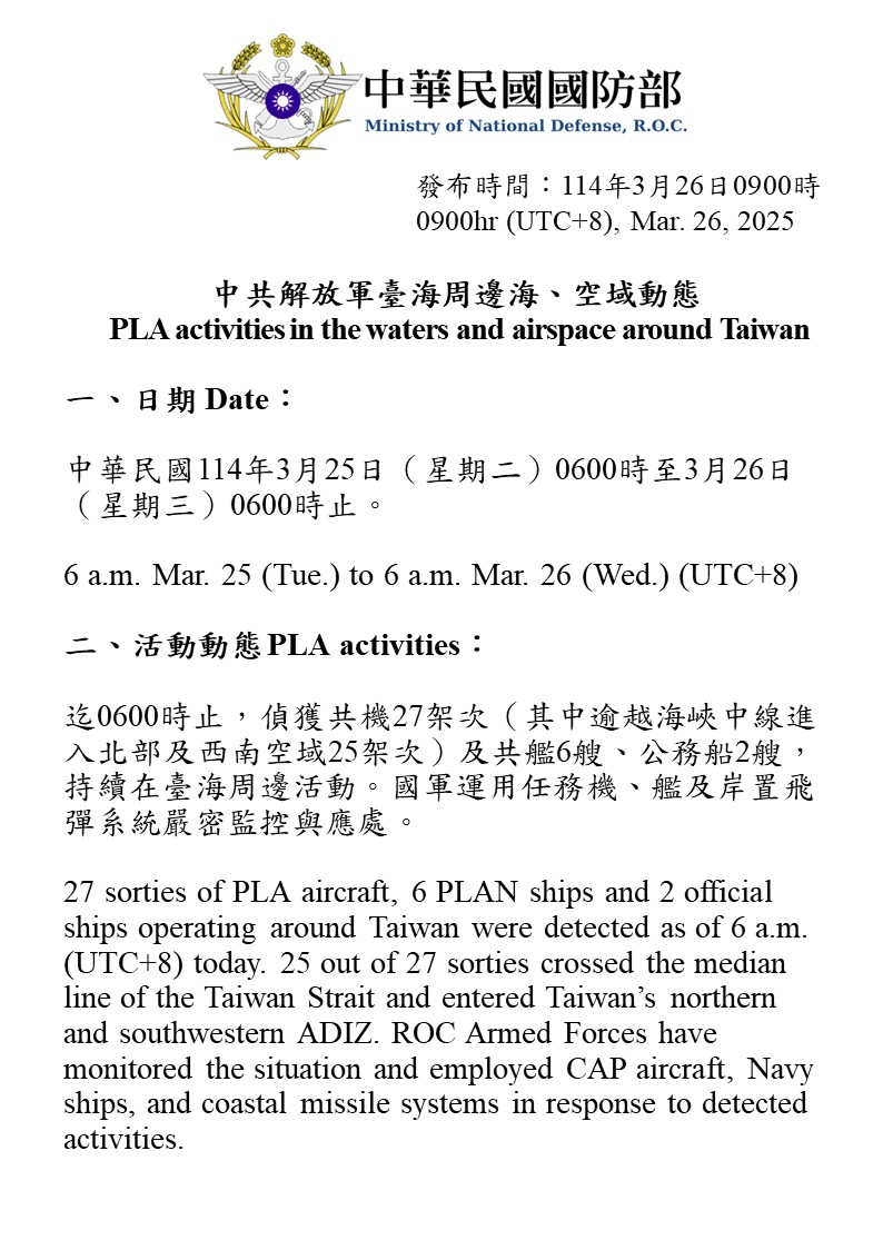 27 sorties of PLA aircraft, 6 PLAN ships and 2 official ships operating around Taiwan were detected as of 6 a.m. (UTC+8) today. 25 out of 27 sorties crossed the median line of the Taiwan Strait and entered Taiwan’s northern and southwestern ADIZ. ROC Armed Forces have monitored the situation and employed CAP aircraft, Navy ships, and coastal missile systems in response to detected activities.