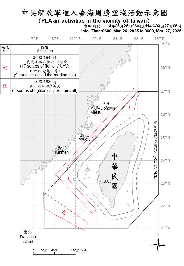 20 sorties of PLA aircraft, 7 PLAN ships and 1 official ship operating around Taiwan were detected as of 6 a.m. (UTC+8) today. 12 out of 20 sorties crossed the median line of the Taiwan Strait and entered Taiwan’s northern and southwestern ADIZ. ROC Armed Forces have monitored the situation and employed CAP aircraft, Navy ships, and coastal missile systems in response to detected activities.