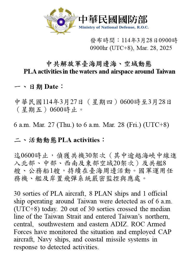 30 sorties of PLA aircraft, 8 PLAN ships and 1 official ship operating around Taiwan were detected as of 6 a.m. (UTC+8) today. 20 out of 30 sorties crossed the median line of the Taiwan Strait and entered Taiwan’s northern, central,  southwestern and eastern ADIZ. ROC Armed Forces have monitored the situation and employed CAP aircraft, Navy ships, and coastal missile systems in response to detected activities.