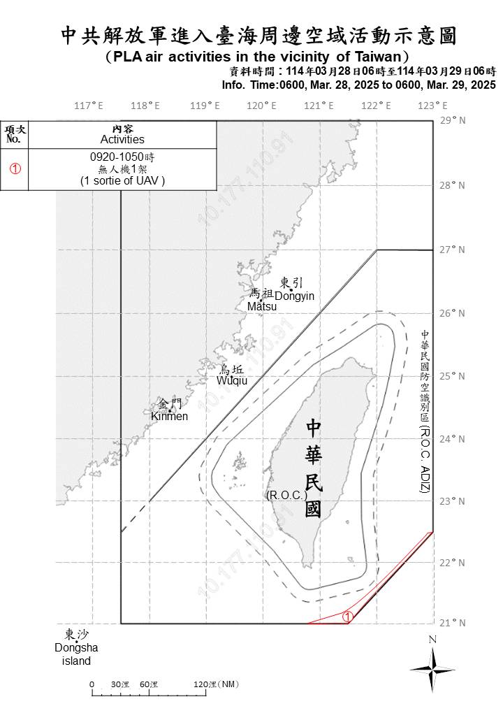 1 sortie of PLA aircraft, 8 PLAN ships and 1 official ship operating around Taiwan were detected as of 6 a.m. (UTC+8) today. 1 sortie entered Taiwan’s eastern ADIZ. ROC Armed Forces have monitored the situation and employed CAP aircraft, Navy ships, and coastal missile systems in response to detected activities.