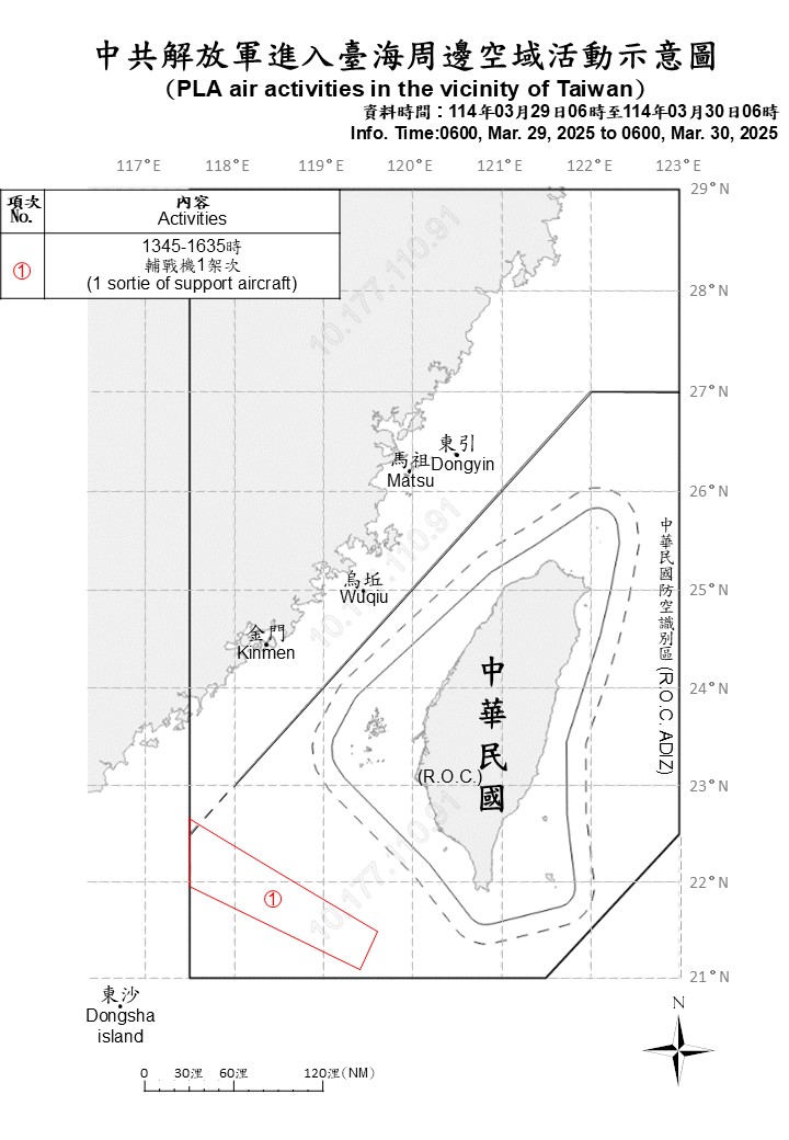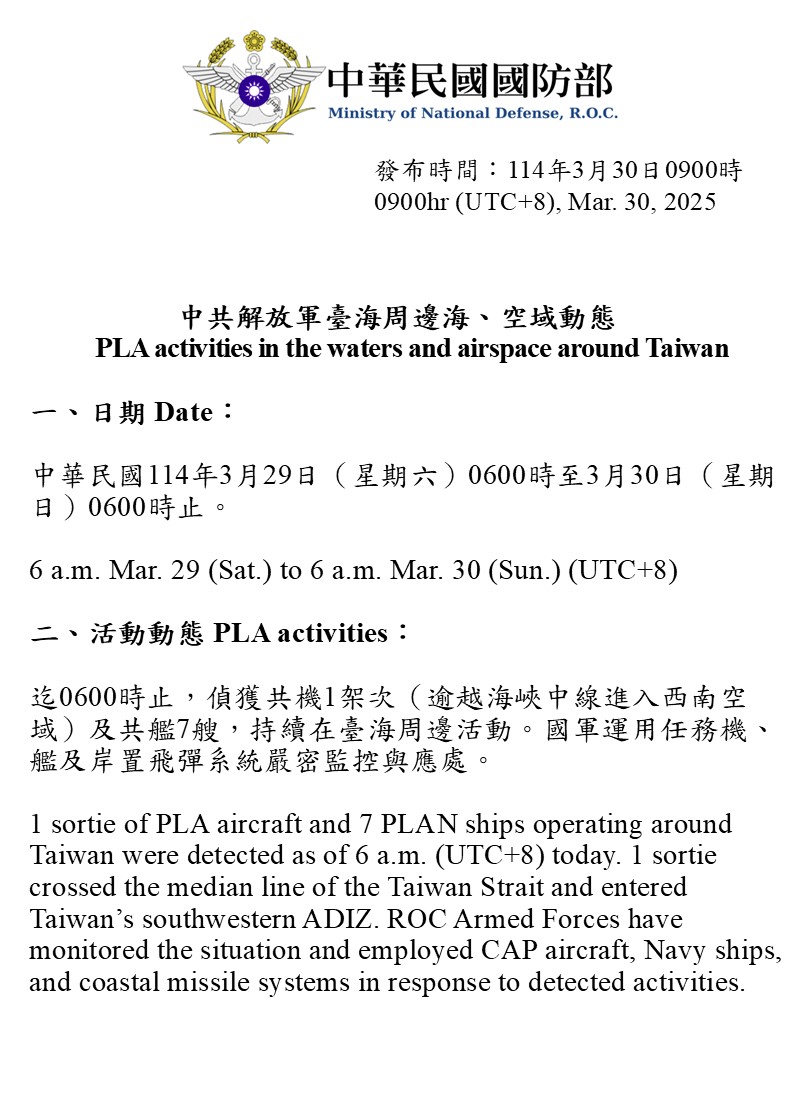 1 sortie of PLA aircraft and 7 PLAN ships operating around Taiwan were detected as of 6 a.m. (UTC+8) today. 1 sortie crossed the median line of the Taiwan Strait and entered Taiwan’s southwestern ADIZ. ROC Armed Forces have monitored the situation and employed CAP aircraft, Navy ships, and coastal missile systems in response to detected activities.