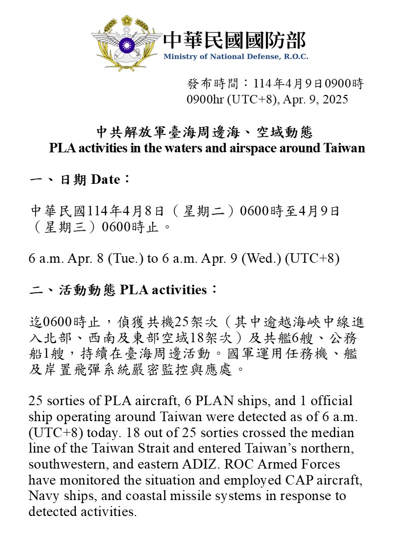25 sorties of PLA aircraft, 6 PLAN ships, and 1 official ship operating around Taiwan were detected as of 6 a.m. (UTC+8) today. 18 out of 25 sorties crossed the median line of the Taiwan Strait and entered Taiwan’s northern, southwestern, and eastern ADIZ. ROC Armed Forces have monitored the situation and employed CAP aircraft, Navy ships, and coastal missile systems in response to detected activities.