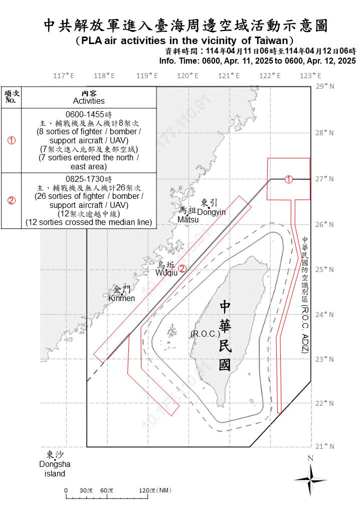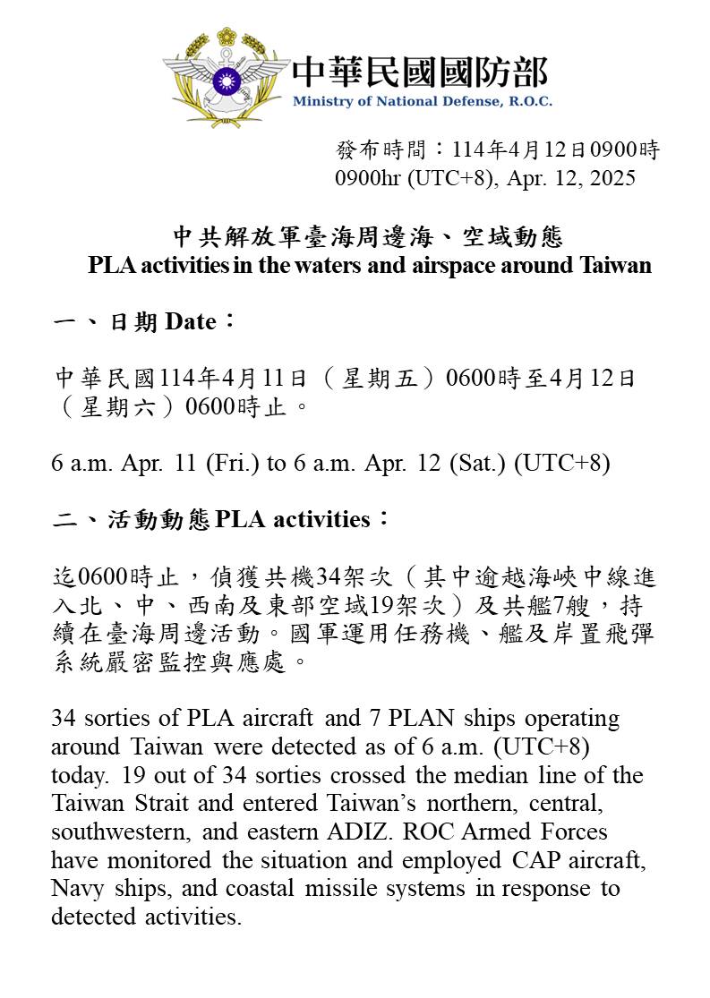 34 sorties of PLA aircraft and 7 PLAN ships operating around Taiwan were detected as of 6 a.m. (UTC+8) today. 19 out of 34 sorties crossed the median line of the Taiwan Strait and entered Taiwan’s northern, central, southwestern, and eastern ADIZ. ROC Armed Forces have monitored the situation and employed CAP aircraft, Navy ships, and coastal missile systems in response to detected activities.