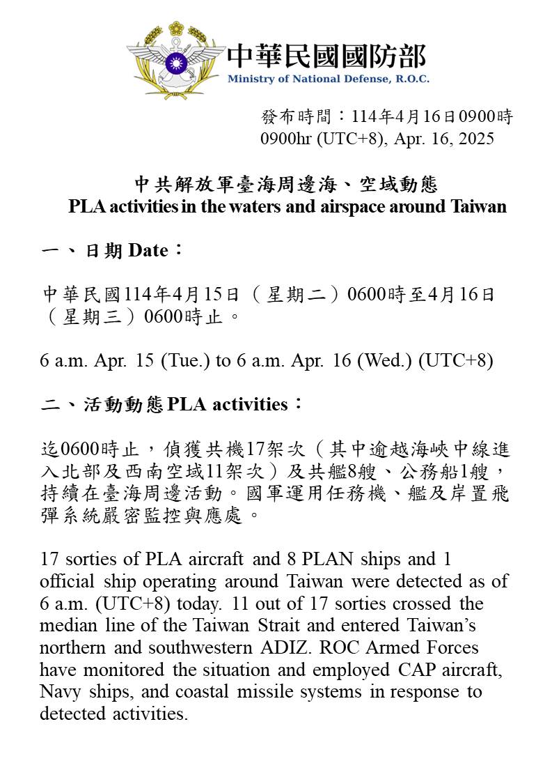 17 sorties of PLA aircraft and 8 PLAN ships and 1 official ship operating around Taiwan were detected as of 6 a.m. (UTC+8) today. 11 out of 17 sorties crossed the median line of the Taiwan Strait and entered Taiwan’s northern and southwestern ADIZ. ROC Armed Forces have monitored the situation and employed CAP aircraft, Navy ships, and coastal missile systems in response to detected activities.