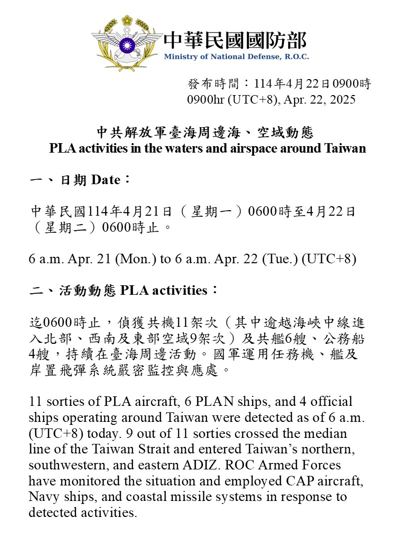 11 sorties of PLA aircraft, 6 PLAN ships, and 4 official ships operating around Taiwan were detected as of 6 a.m. (UTC+8) today. 9 out of 11 sorties crossed the median line of the Taiwan Strait and entered Taiwan’s northern, southwestern, and eastern ADIZ. ROC Armed Forces have monitored the situation and employed CAP aircraft, Navy ships, and coastal missile systems in response to detected activities.