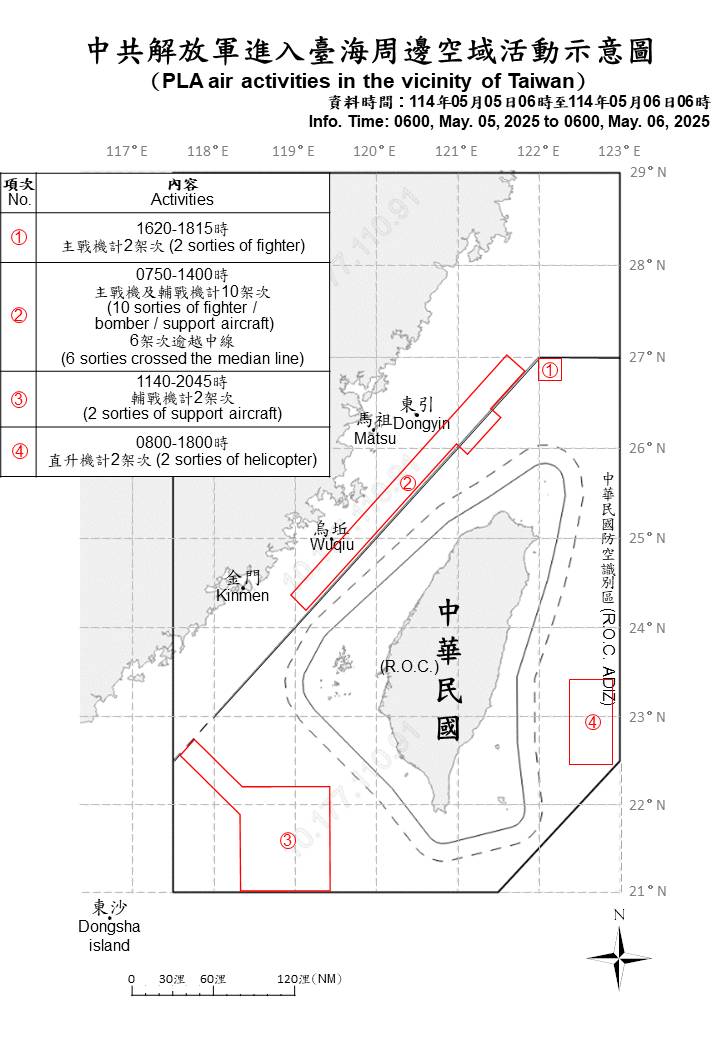 16 sorties of PLA aircraft and 12 PLAN ships operating around Taiwan were detected as of 6 a.m. (UTC+8) today. 12 out of 16 sorties crossed the median line of the Taiwan Strait and entered Taiwan’s northern, southwestern, and eastern ADIZ. ROC Armed Forces have monitored the situation and employed CAP aircraft, Navy ships, and coastal missile systems in response to detected activities.