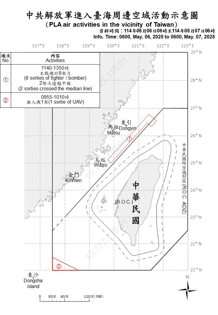 9 sorties of PLA aircraft, 9 PLAN ships and 1 official ship operating around Taiwan were detected as of 6 a.m. (UTC+8) today. 3 out of 9 sorties crossed the median line of the Taiwan Strait and entered Taiwan’s northern and southwestern ADIZ. ROC Armed Forces have monitored the situation and employed CAP aircraft, Navy ships, and coastal missile systems in response to detected activities.