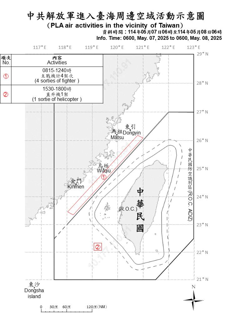 5 sorties of PLA aircraft, 8 PLAN ships and 1 official ship operating around Taiwan were detected as of 6 a.m. (UTC+8) today. 1 out of 5 sorties entered Taiwan’s southwestern ADIZ. ROC Armed Forces have monitored the situation and employed CAP aircraft, Navy ships, and coastal missile systems in response to detected activities.