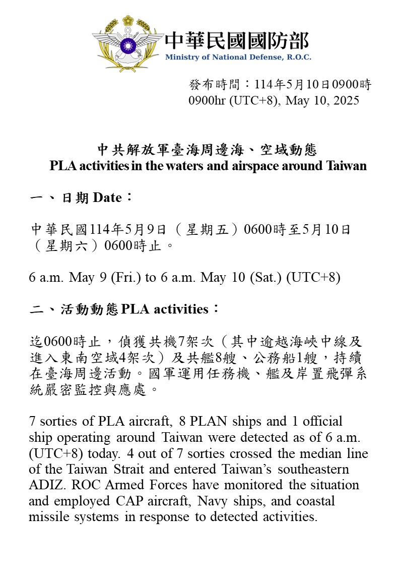 7 sorties of PLA aircraft, 8 PLAN ships and 1 official ship operating around Taiwan were detected as of 6 a.m. (UTC+8) today. 4 out of 7 sorties crossed the median line of the Taiwan Strait and entered Taiwan’s southeastern ADIZ. ROC Armed Forces have monitored the situation and employed CAP aircraft, Navy ships, and coastal missile systems in response to detected activities.