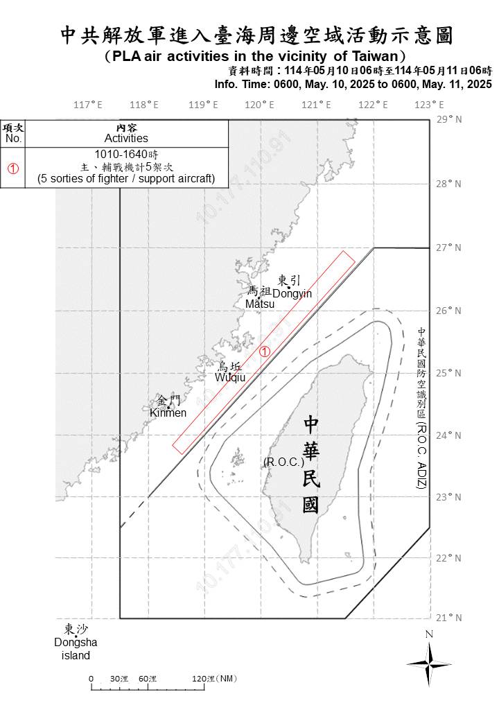 5 sorties of PLA aircraft, 9 PLAN ships and 1 official ship operating around Taiwan were detected as of 6 a.m. (UTC+8) today. ROC Armed Forces have monitored the situation and employed CAP aircraft, Navy ships, and coastal missile systems in response to detected activities.