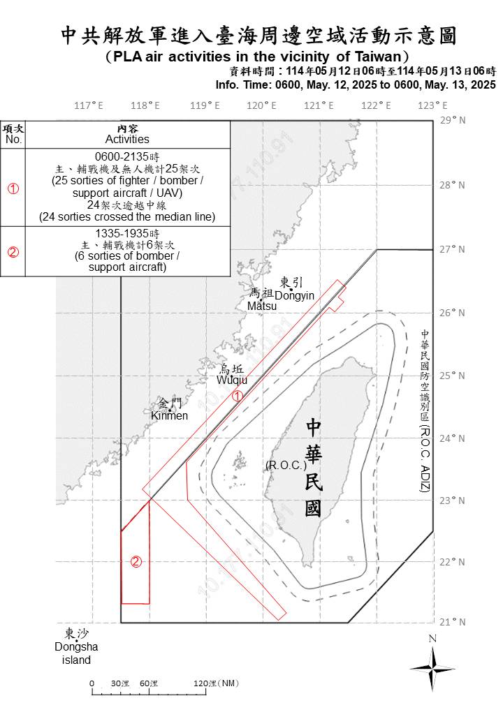 31 sorties of PLA aircraft, 7 PLAN ships, and 1 official ship operating around Taiwan were detected as of 6 a.m. (UTC+8) today. 30 out of 31 sorties crossed the median line of the Taiwan Strait and entered Taiwan’s northern and southwestern ADIZ. ROC Armed Forces have monitored the situation and employed CAP aircraft, Navy ships, and coastal missile systems in response to detected activities.