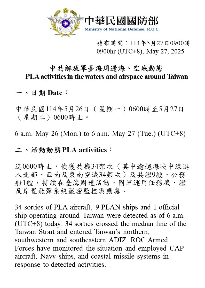 34 sorties of PLA aircraft, 9 PLAN ships and 1 official ship operating around Taiwan were detected as of 6 a.m. (UTC+8) today. 34 sorties crossed the median line of the Taiwan Strait and entered Taiwan’s northern, southwestern and southeastern ADIZ. ROC Armed Forces have monitored the situation and employed CAP aircraft, Navy ships, and coastal missile systems in response to detected activities.